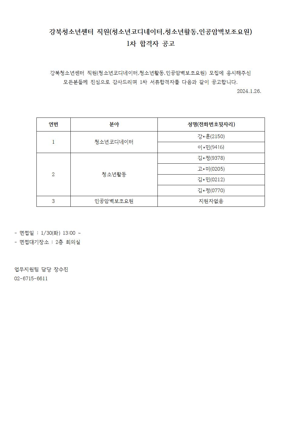 강북청소년센터 직원(청소년코디네이터,청소년활동,인공암벽보조요원) 1차 합격자 공고