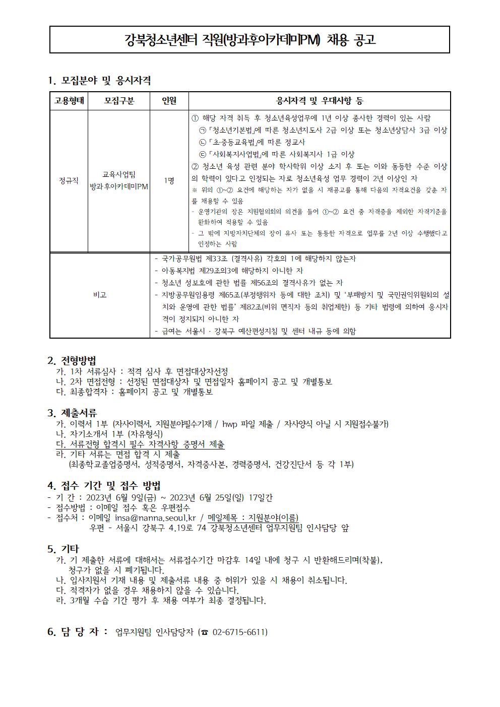 강북청소년센터 직원(방과후아카데미PM) 1차 합격자 공고