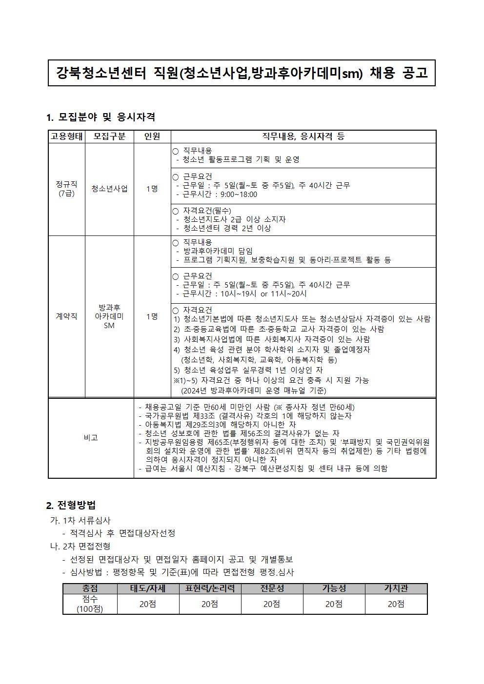 강북청소년센터 직원(청소년사업,방과후아카데미sm) 채용 공고