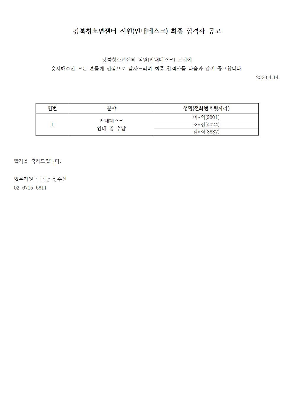 강북청소년센터 직원(안내데스크) 최종 합격자 공고