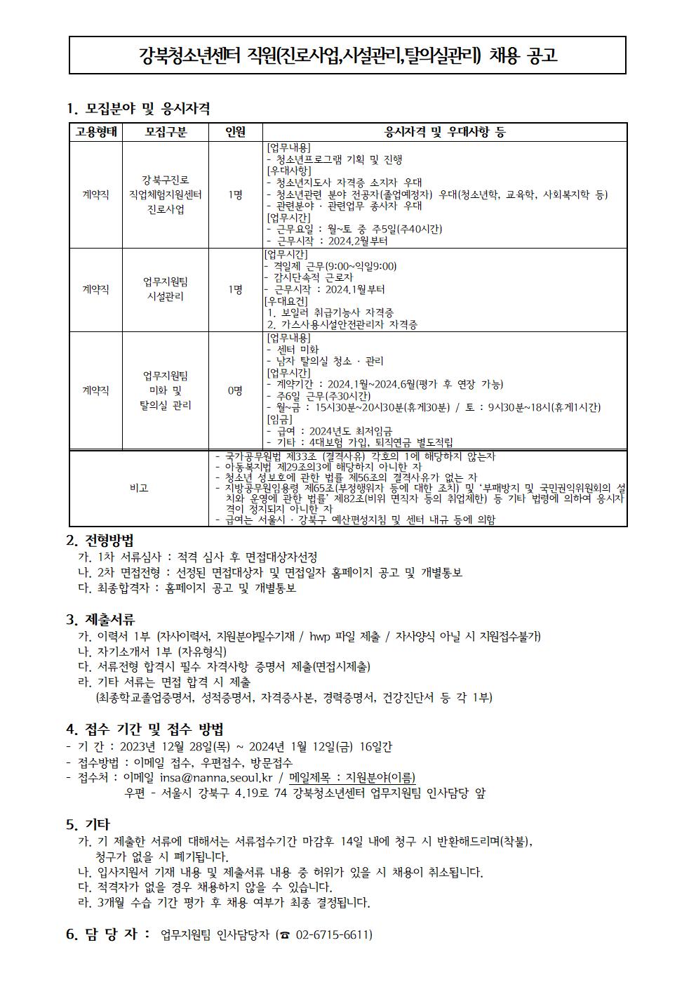 강북청소년센터 직원 채용 공고(진로사업,시설관리,탈의실관리)