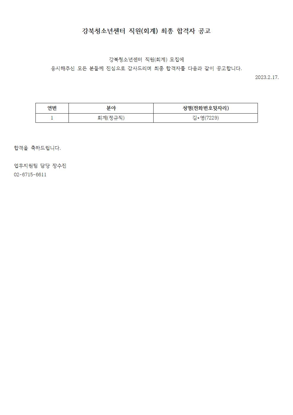 강북청소년센터 직원(회계) 최종 합격자 공고