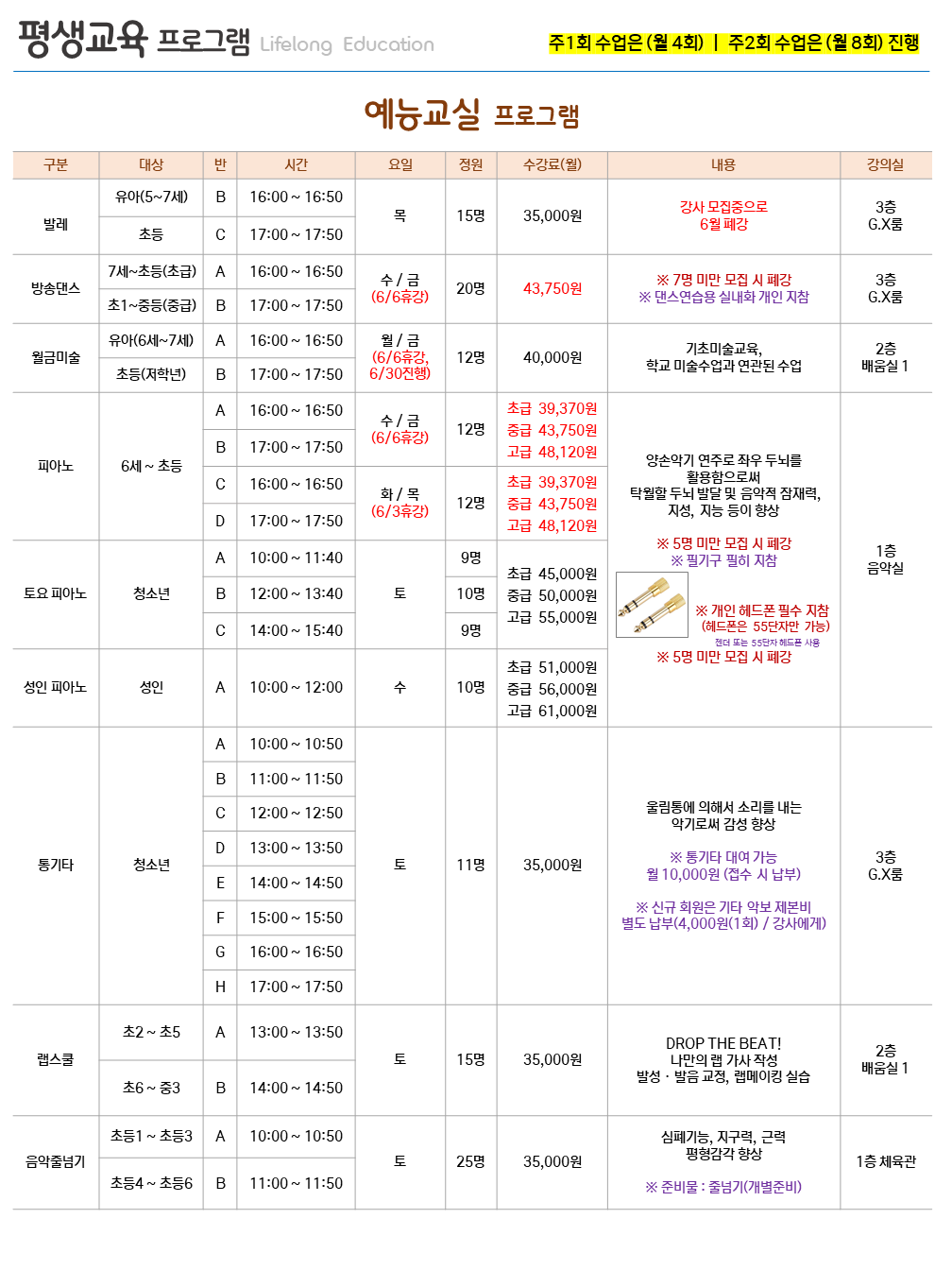 ※ 평생교육은 주1회 수업은(월 4회), 주2회 수업은(월 8회) 진행됩니다. (5주차일 경우 마지막 주 수업 미진행)