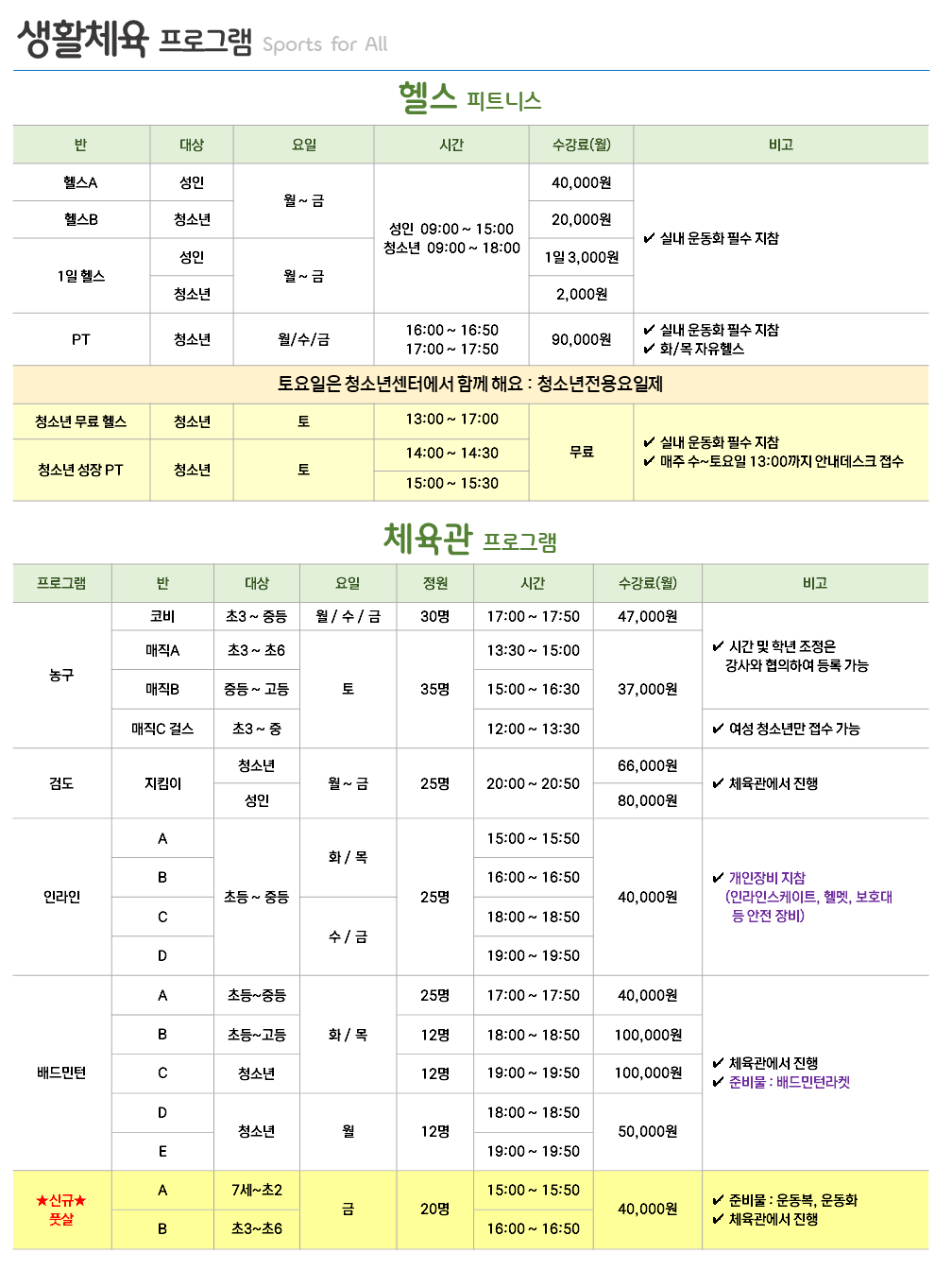 - 신규회원접수 시 전화 문의량이 많아 바로 연결이 어려울 수 있으니, 프로그램 관련 문의사항은 접수 전에 전화 부탁드립니다.