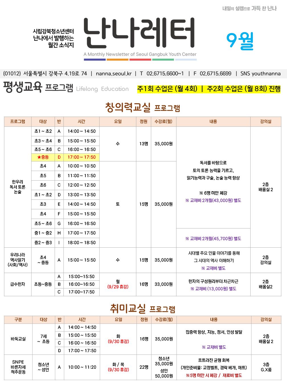 ※ 세부 프로그램 내용은 전화문의(02-6715-6600) 및 아래 난나레터를 확인 바랍니다.