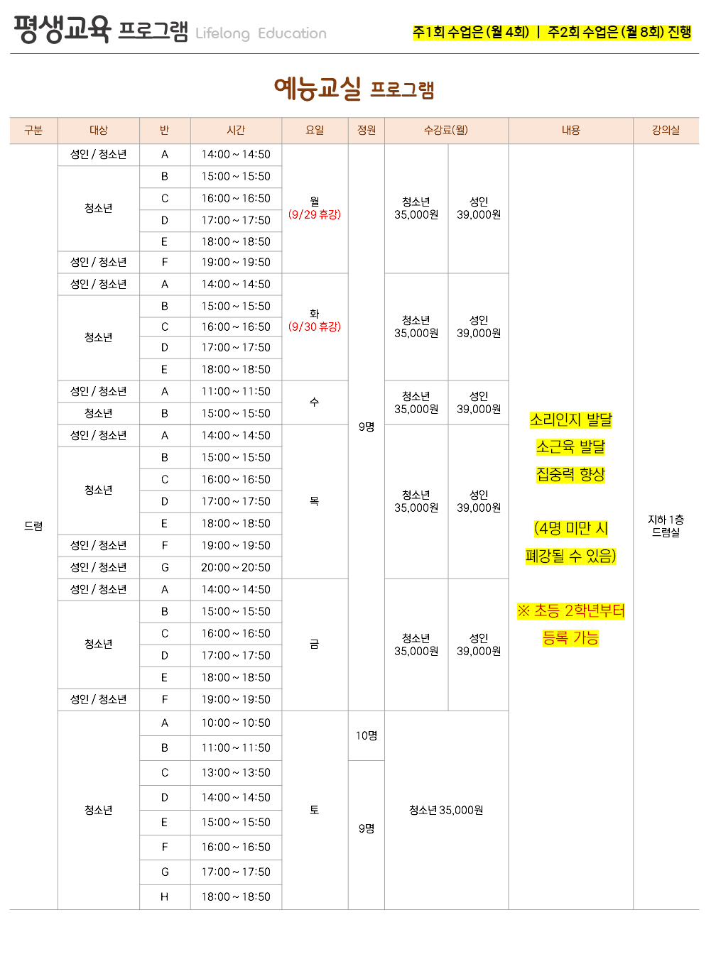 ※ 평생교육은 주1회 수업은(월 4회), 주2회 수업은(월 8회) 진행됩니다. (5주차일 경우 마지막 주 수업 미진행)